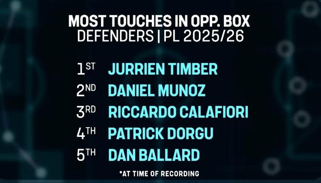 你在禁區內的觸球次數,在英超后衛中也名列前茅。